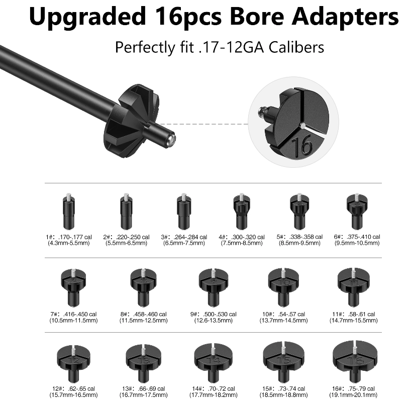 • Fit all calibers: Laser bore sight kit comes with 16pcs bore adapters to fit 22lr to 12GA caliber for pistols, rifles, handguns. Simply choose the caliber adapter and place the bore sighter unit in the muzzle.