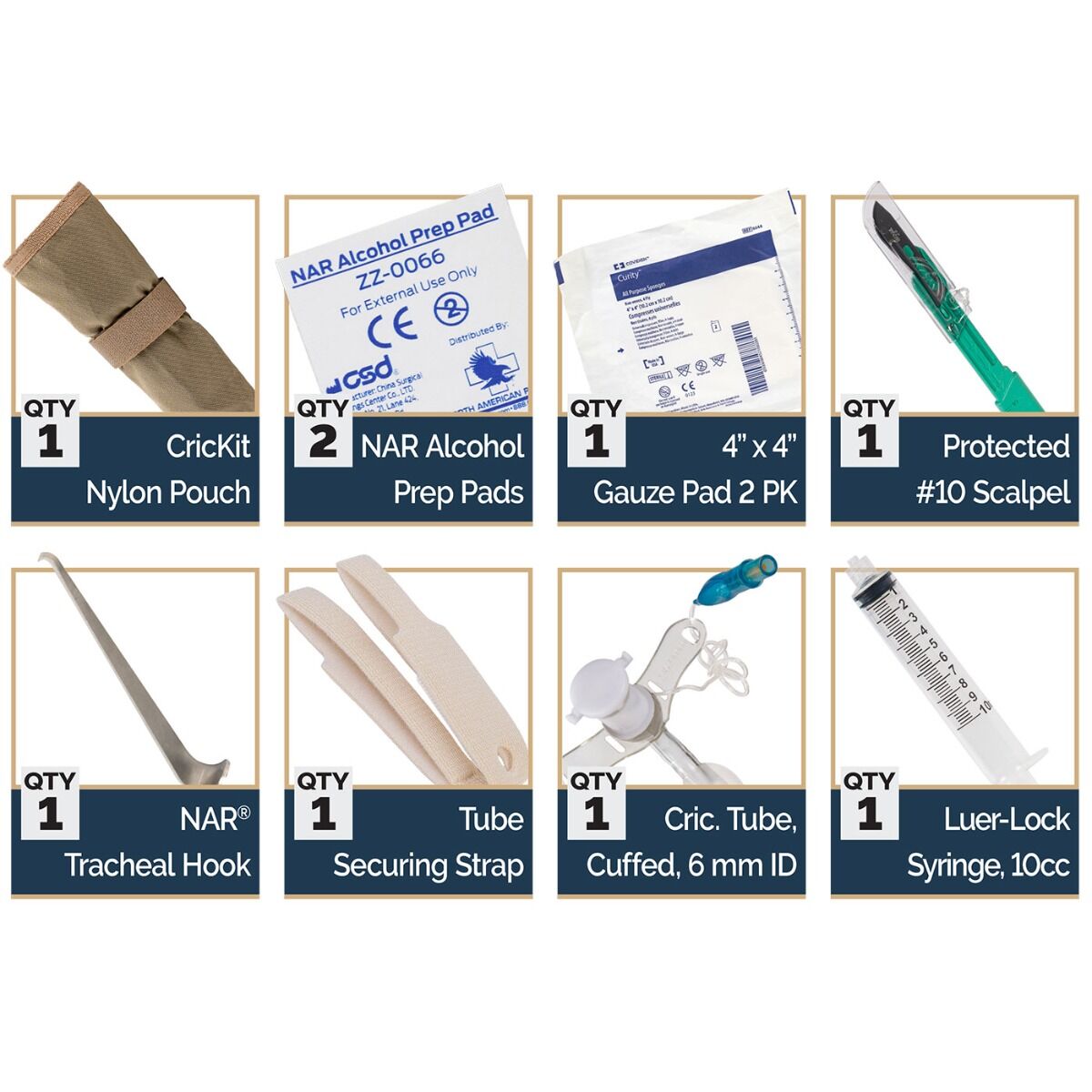 - Provides all of the components necessary to conduct a surgical cricothyroidotomy correctly